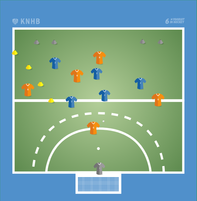 Maak een veld zoals op de afbeelding. Oranje speelt met keeper tegen blauw.