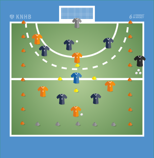 Maak een veld zoals op de tekening. Maak een achterlijn van afwijkende kleurtjes. Maak twee teams en wijs één joker aan.