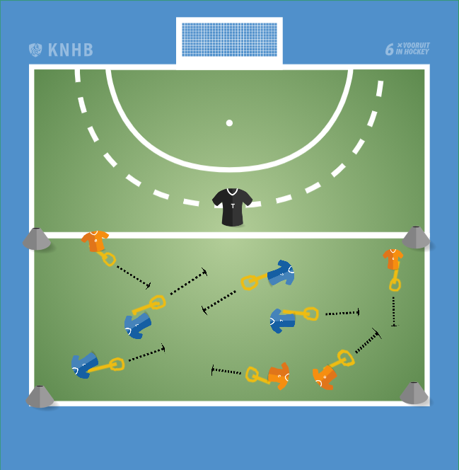 Alle kinderen staan in een groot vierkant met stok en ring. Ze gaan zich vrij voortbewegen in het vierkant. De trainer noemt één van de vier kleuren van de pylonen waarmee het vierkant is uitgezet. De kinderen moeten daar zo snel mogelijk naartoe.