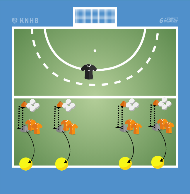 Alle kinderen staan in tweetallen ter hoogte van de grijze pylon. Per keer pakken ze één bal en alle ballen liggen bij de oranje pylon. Ze rennen naar de ballen, pakken er één en gooien vervolgens de bal in de goal. Zodra de bal gegooid is, mag de ander starten.