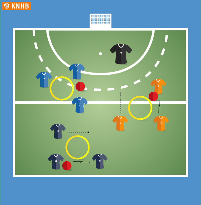 De kinderen staan in drietallen om een hoepel. Ze spelen met de voet (schoppen) de grote bal naar elkaar over. De bal mag niet door de hoepel heen, dus ze zullen een beetje mee moeten stappen om aanspeelbaar te zijn voor elkaar.