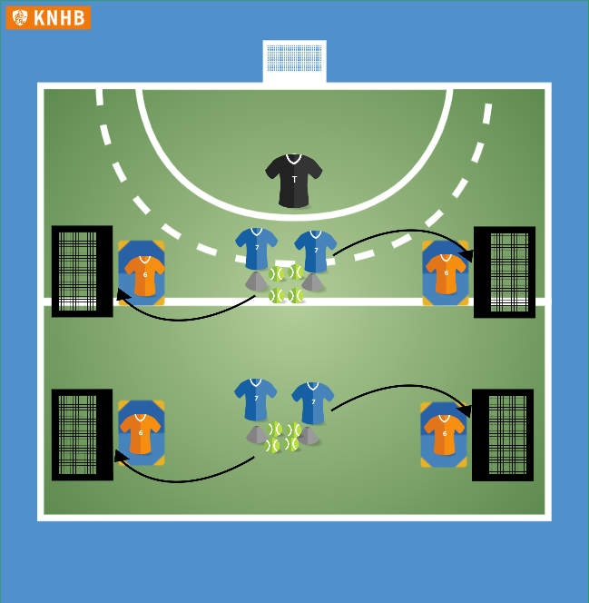 We hebben een keeper die op zijn/haar knieƫn zit voor de goal en op de mat. Het tweede kind gaat proberen vanaf de grijze pylon te scoren door de tennisballen te gooien. De keeper mag met alle lichaamsdelen de bal tegen houden.