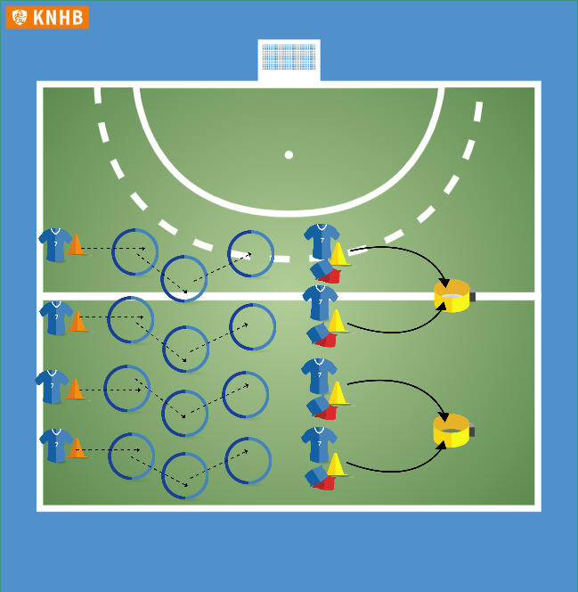 Kinderen starten in tweetallen een estafette. Het doel is pittenzakken in de korfbalmand te gooien vanaf de oranje pylon. Voor ze dat kunnen doen, moeten ze eerst een pittenzak halen aan het einde van de hoepels rij. Daar is de vloer lava, dus ze springen van hoepel naar hoepel en moeten vanuit de laatste hoepel de pittenzak pakken (één per keer).