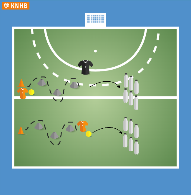 Ze gaan om de pylonen slalommen met de bal aan hun voet. Daarna schoppen ze de flessen of pylonen op de kop gezet om, net zoals bij bowlen. Laat ze zelf te flessen/pylonen weer terug recht zetten. Daarna kan de volgende starten.