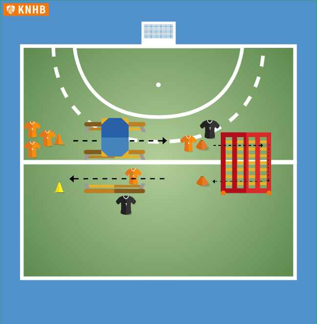 De kinderen starten met onder de mat door kruipen, vervolgens klimmen in het rek links, boven doorschuiven naar rechts en daar naar beneden klimmen. Op de terugweg balanceren ze over een omgekeerde bank terug naar het begin.