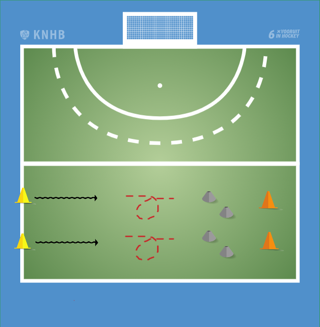 Het is een estafette. Kinderen lopen over het touw waar ze balans moeten behouden. Zodra ze van het touw af zijn maken ze een koprol. Daarna lopen ze door naar de twee grijze pylonen en daar maken ze een rondje om hun eigen as (staand). Via de oranje pylon rennen ze terug naar de start.