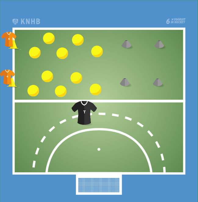 Estafette, eerst paar keer oefenen en dan een wedstrijd. Kinderen starten in verschillende posities; liggend, hurkzit, met gezichten naar elkaar toe, rug naar de baan, etc. Vervolgens springen ze van hoepel naar hoepel. Bij de grijze pylonen maken ze 2x een koprol (of radslag).