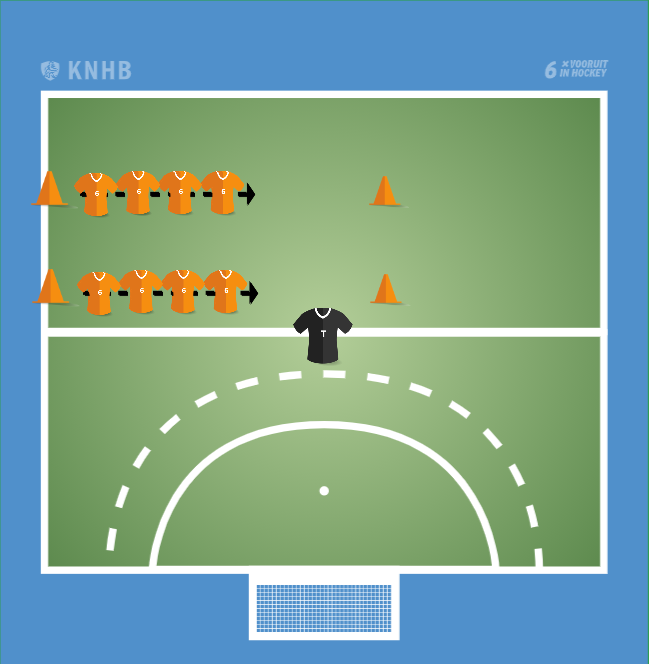 De kinderen gaan als een slinger achter elkaar staan. We maken twee slingers van vier kinderen. Ze gaan een wedstrijd doen tegen elkaar, wie als eerste aan de overkant is. Elke keer krijgen ze een andere opdracht, bijvoorbeeld dat ze onder elkaar doorkruipen of bokje springen. De achterste kruipt dan onder de andere vier door, sluit vooraan aan, etc. Zo verplaatsen ze zich van pylon naar pylon.