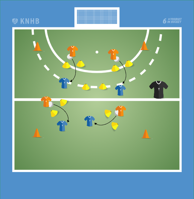 De kinderen bewegen in tweetallen door het vierkant. Je kunt als tweetal scoren door een bal over te gooien door het doeltje. Het is niet toegestaan om twee keer achter elkaar in hetzelfde doeltje te scoren. Geef ze een opdracht mee die focust op rollen of duiken, bijvoorbeeld dat ze na elke goal een rondje om hun eigen as moeten draaien, of koprol/radslag maken, boomstamrollen, etc.