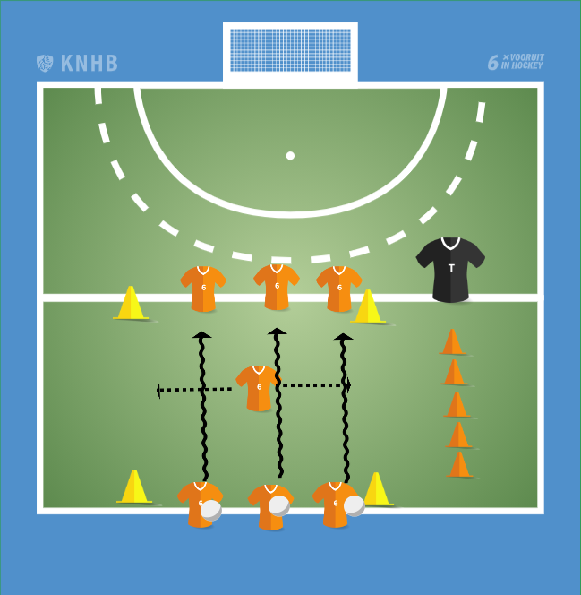Kinderen staan in tweetallen tegenover elkaar met per tweetal één grote bal. Ze gaan de bal overschoppen. Ondertussen gaat de tikker in het midden proberen de ballen te onderscheppen. Is de bal onderschept, leg je een pylon om tot alle vijf de pylonen om zijn. Dan wissel je van tikker.