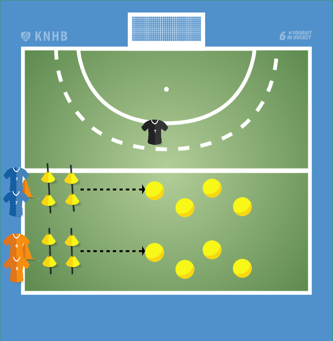 Het is een estafette. Kinderen starten met springen over twee stokken. Vervolgens rennen ze achteruit naar de hoepels en daar springen ze van hoepel naar hoepel. Dan terug rennen en het volgende kind aantikken.