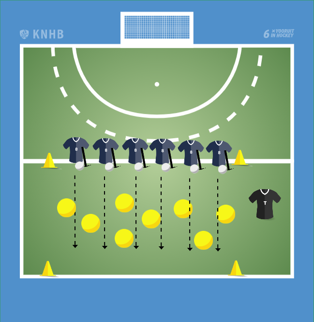 Alle kinderen hebben een knots en bal. Ze gaan oversteken en in het midden liggen hoepels als hindernissen, daar moeten ze omheen bewegen met de knots en bal.