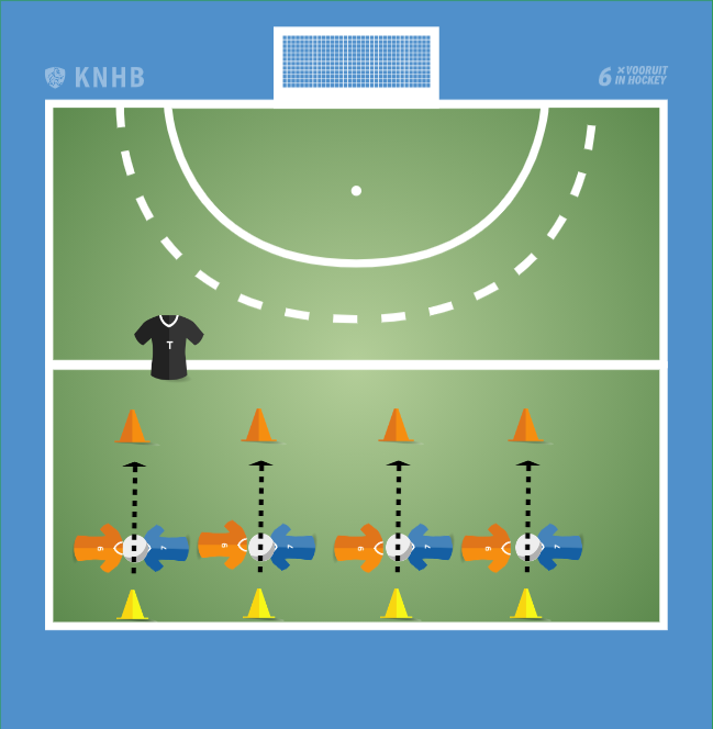 De kinderen staan in tweetallen met de ruggen naar elkaar toe. Ze klemmen een grote bal tussen elkaars rug en lopen naar de pylon.