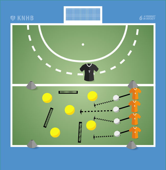 Maak een speelveld met allemaal hindernissen. De kinderen gaan met knotsstick en bal van de ene kant naar de andere kant lopen. Onderweg moeten ze de hindernissen ontwijken.