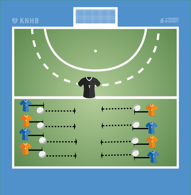 Alle kinderen hebben een knots met een grote bal en staan tegenover elkaar. De knots gebruiken ze als hockeystick en ze gaan de bal naar de overkant brengen. Onderweg komen ze elkaar tegen. Bij oogcontact spelen ze de bal naar elkaar en lopen ze door naar de overkant met de bal van de ander.