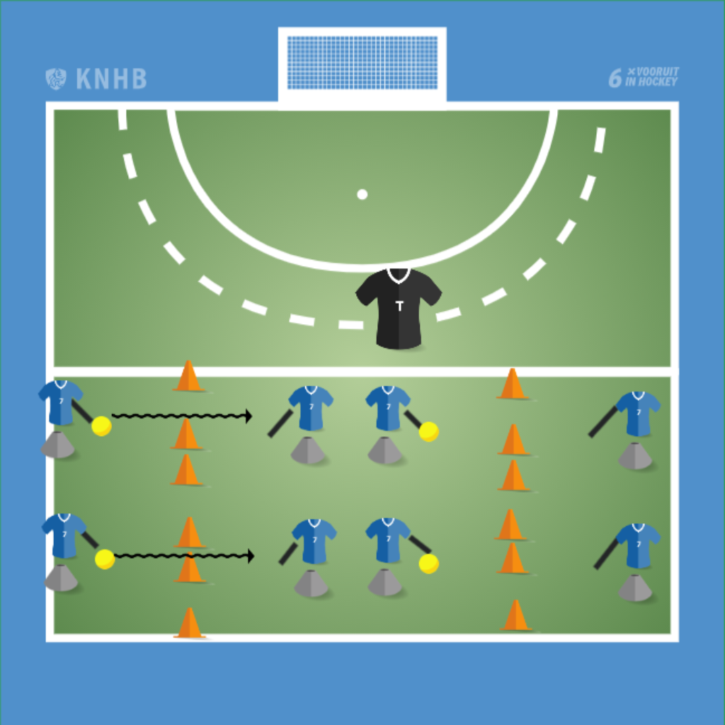 Kinderen staan tegenover elkaar met ieder een knotsstick in hun hand. Tussen hun in staan drie grote pylonen. Ze gaan de bal door de pylonen mikken. Voor elke keer dat ze raak mikken, krijgen ze een punt. Zorg dat het ene goaltje kleiner is dan het andere, zodat ze twee punten kunnen verdienen bij het kleinere goaltje.