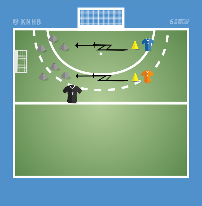 De estafette start bij de gele pylon. Ze rennen naar twee hekjes (of hoge pylonen) waar ze overheen springen. Vervolgens rennen ze om de pylonen en klimmen ze op het hek, bank in de dug-out of container, waar ze ook weer vanaf springen.
