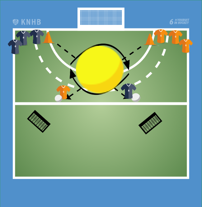 De kinderen beginnen bij de grijze pylon met de grote bal in hun hand. Ze moeten onder de parachute door kruipen, met de bal in hun hand. Zodra ze onder de parachute vandaan zijn, schoppen ze de bal in de goal. Laat ze zelf de bal uit de goal halen en terug naar de oranje pylon gaan.