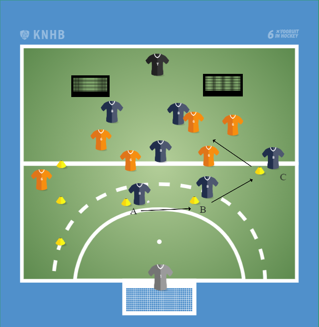 • Vervolgens is het een 6 tegen 6, waarbij oranje op de grote goal scoort en blauw op de 2 zwarte goaltjes.