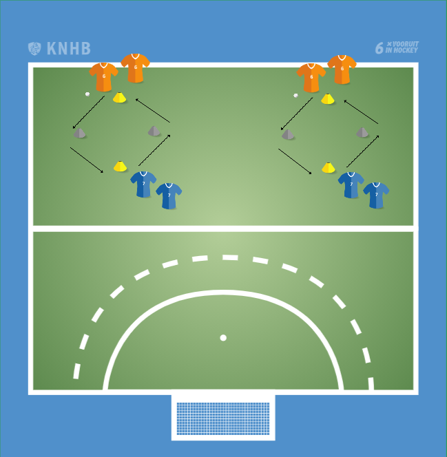 Maak een vierkant van 10 bij 10 meter. Gebruik twee kleuren hoedjes voor het vierkant.