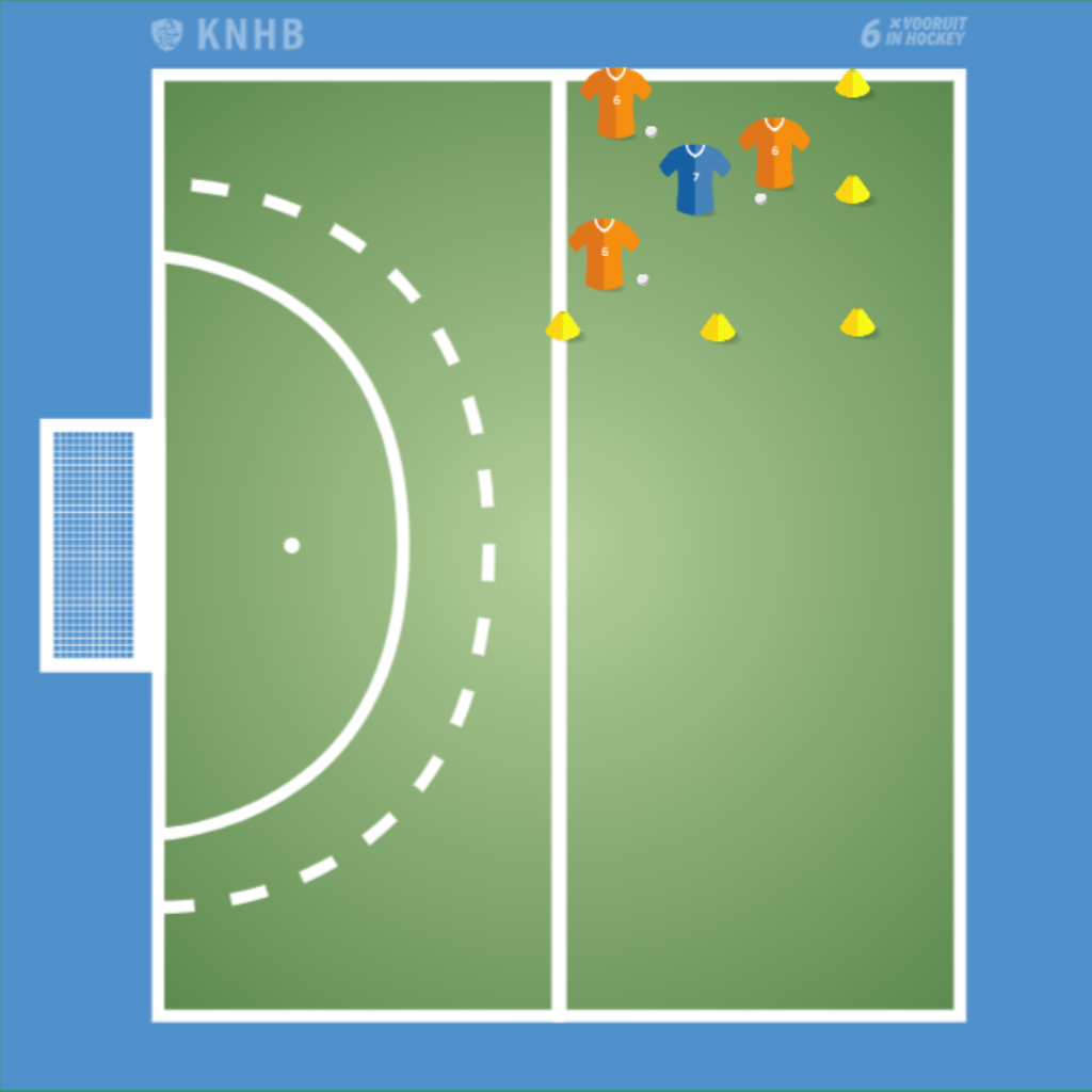 In een gebied van 10 tot 15 meter breed staan alle spelers met een bal in het veld. Er is 1 verdediger die alle ballen van de sticks probeert te 'prikken'.