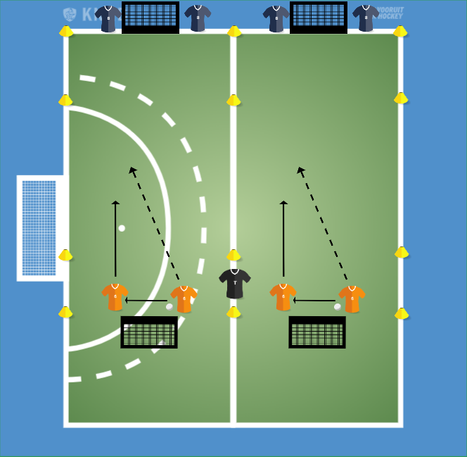 Maak 2 lange velden, met aan beide kanten een goal. Vorm tweetallen. Ieder tweetal begint naast een goaltje.