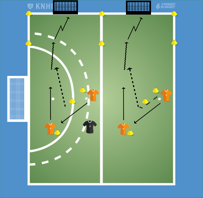 Maak een veld zoals op de afbeelding. Pas de afstanden aan als de speler de bal in het scoringsgebied pas aanneemt. Zet de oefening 2 keer uit als er meer dan 4 spelers zijn.