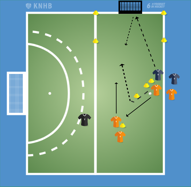 Maak het veld zoals op de afbeelding. Pas de afstanden aan als de blauwe speler te snel bij de speler is die de bal moet aannemen.