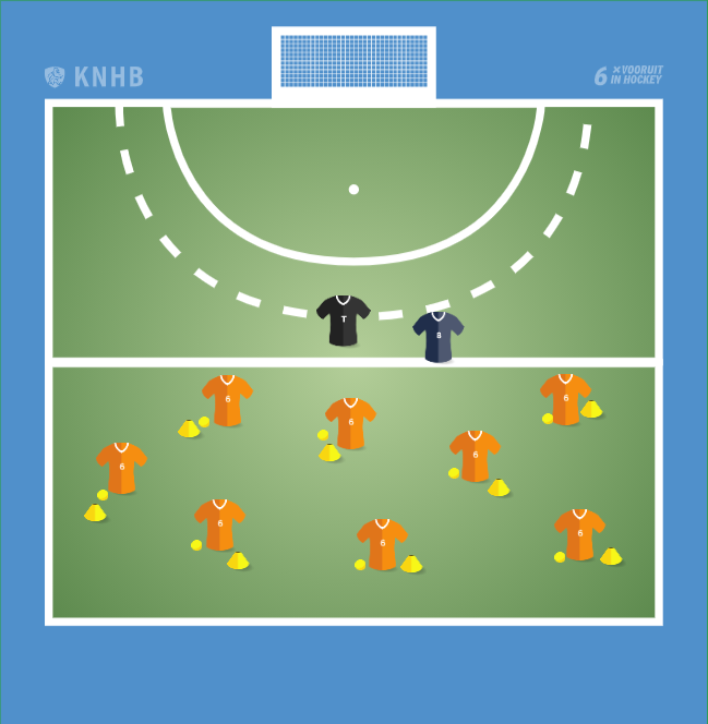 Verdeel evenveel hoedjes als dat er spelers zijn over het veld. Iedere speler staat bij een hoedje.