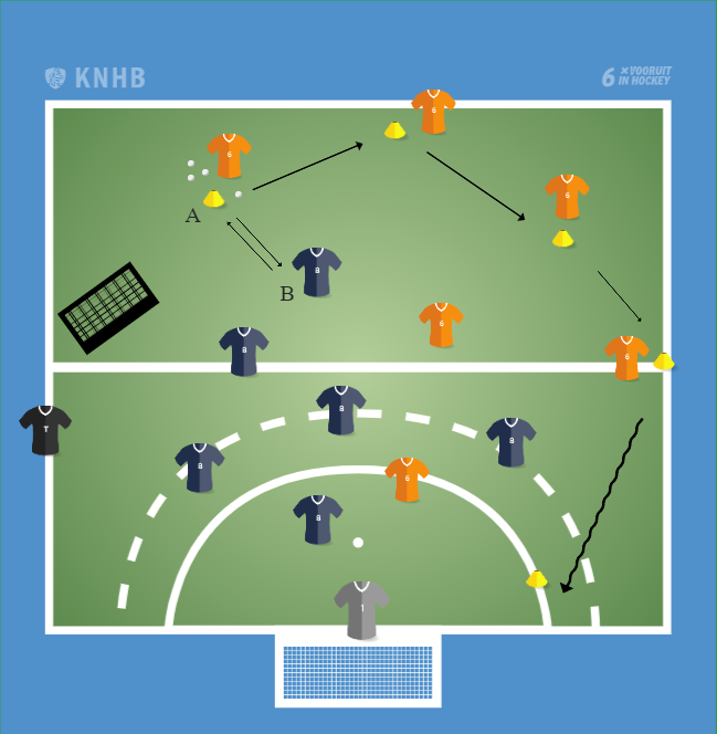Maak een veld zoals op de afbeelding. Meer druk op de spelers leggen? Maak het veld dan smaller.