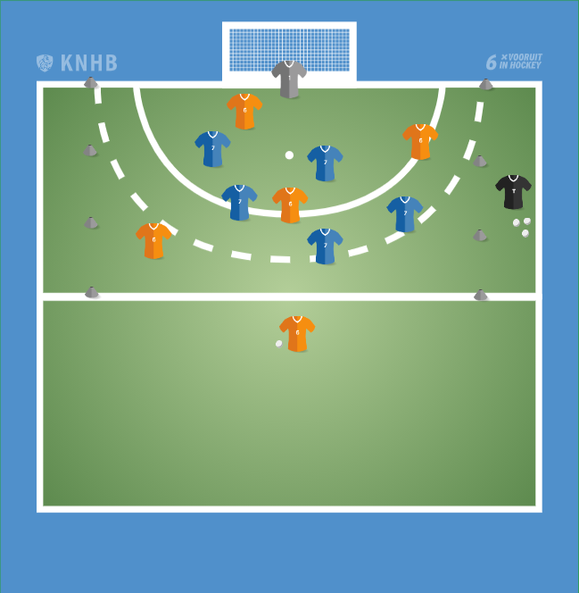 Maak een veld met de zijlijnen op de kruising stippelcirkel en achterlijn. Vorm 2 teams. Oranje begint met 1 speler achter de 23-meterlijn met de bal.