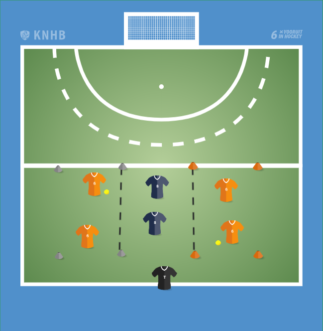 Maak 2 vakken die ongeveer 5 meter uit elkaar staan, zodat er een sloot ontstaat tussen de 2 vakken. In beide vakken staan 2 oranje spelers en in de sloot tussen de vakken staan 2 blauwe spelers.