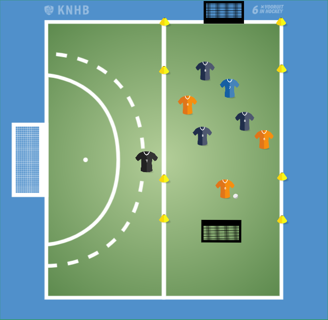 Maak een veld met voor beide teams een goal om op te scoren. Maak 2 teams en geef 1 speler een ander kleur hesje. Deze speler is de kameleon.
