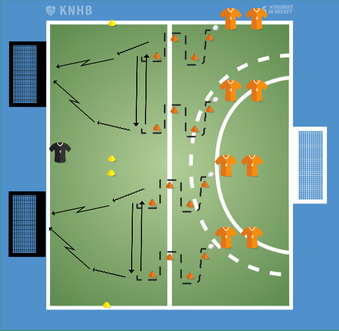 Maak 2 slalommen. Verdeel de spelers over de slalommen. Zijn er meer dan 5 spelers? Dan zet je de oefening 2 keer uit.