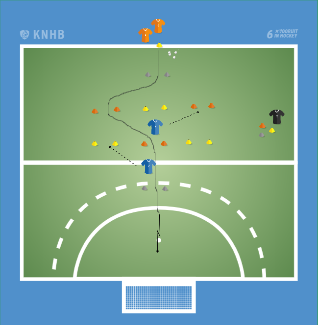 De spelers starten bij de grijze pylon. 2 verdedigers starten in het midden bij de 3 rijen poortjes. 1 verdediger bij de eerste rij en 1 speler bij de tweede rij.