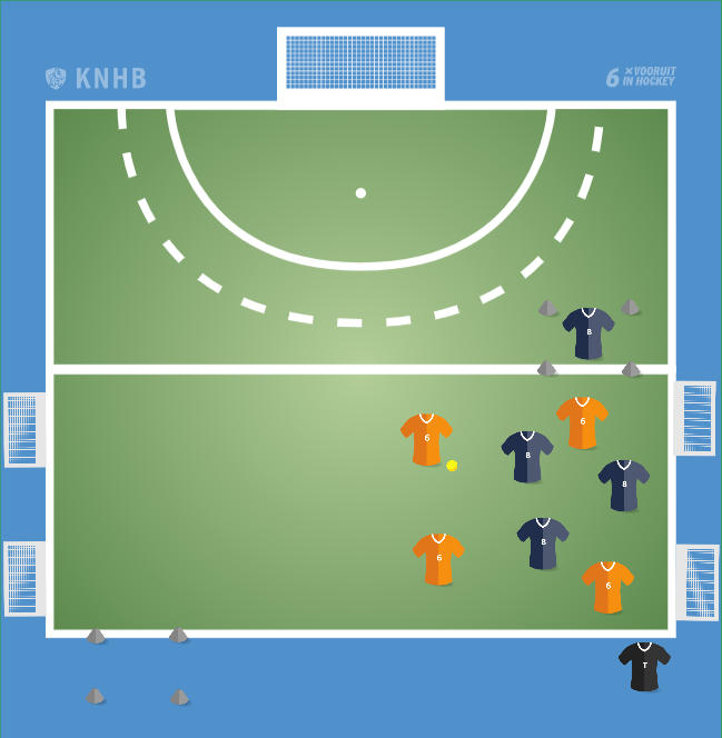 • De 4 aanvallers moeten scoren in de 2 kleine goaltjes, tegen 3 verdedigers.
