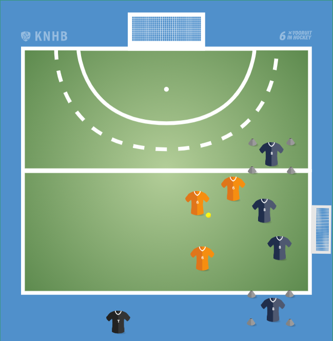 Maak een veld met 2 goaltjes en aan de zijlijn een wachtvak. 3 aanvallers (oranje) en 2 verdedigers (blauw) starten in het veld. 1 verdediger staat in het wachtvak.