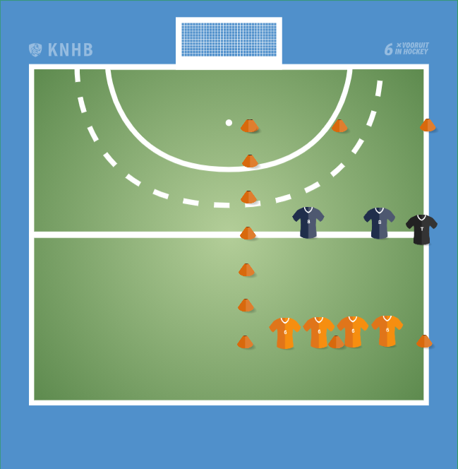 • Er staan 2 tikkers op de middenlijn van het vak. De overige spelers (overlopers) op de achterlijn van het vak.