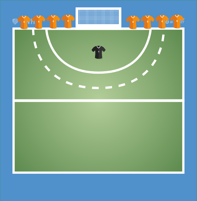 Verdeel de groep over de achterlijn, met onderling 2 meter tussenruimte. De oefening wordt individueel verricht, maar het gehele team voert de oefening gelijktijdig uit. Houd ongeveer hetzelfde tempo aan.