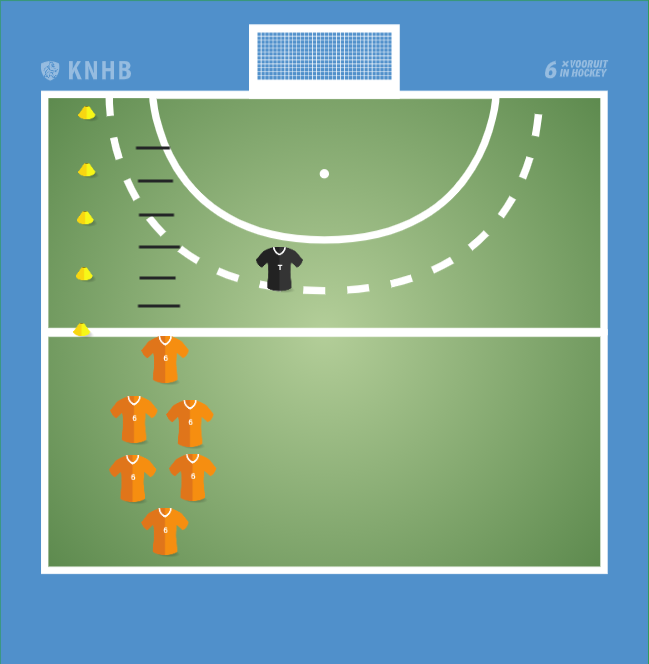 De sticks (zwarte lijntjes op de tekening) liggen in een rij op de grond, zoals de strepen van een zebra. De hoedjes staan ingesprongen, zoals bij een slalom. De spelers staan in een rij opgesteld bij het startpunt.