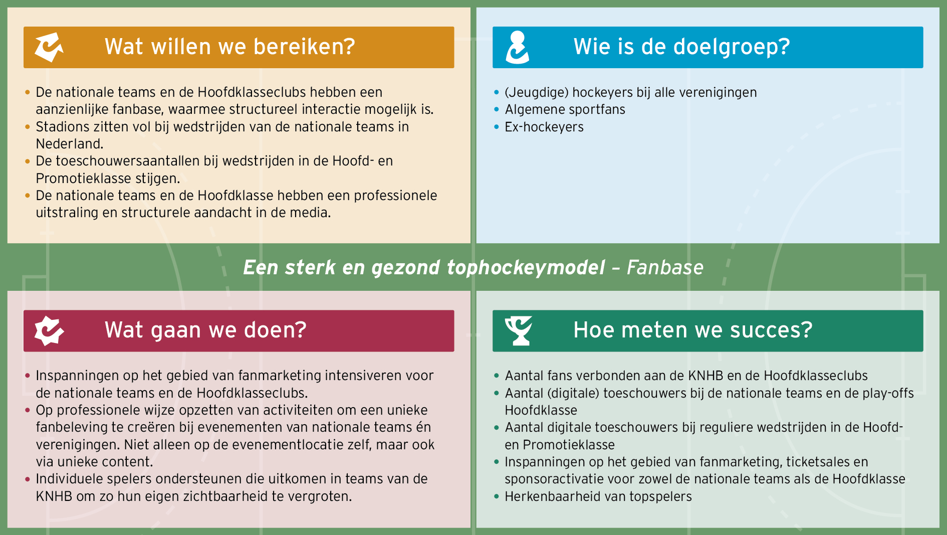 Met mooie wedstrijden, goede prestaties en aansprekende hockeyhelden kunnen we meer fans vermaken en enthousiast maken voor de hockeysport. Tophockey kijken is een beleving! We bouwen aan een kwalitatieve fanbase met als doel meer betrokkenheid, meer fans en meer inkomsten voor verenigingen en KNHB.