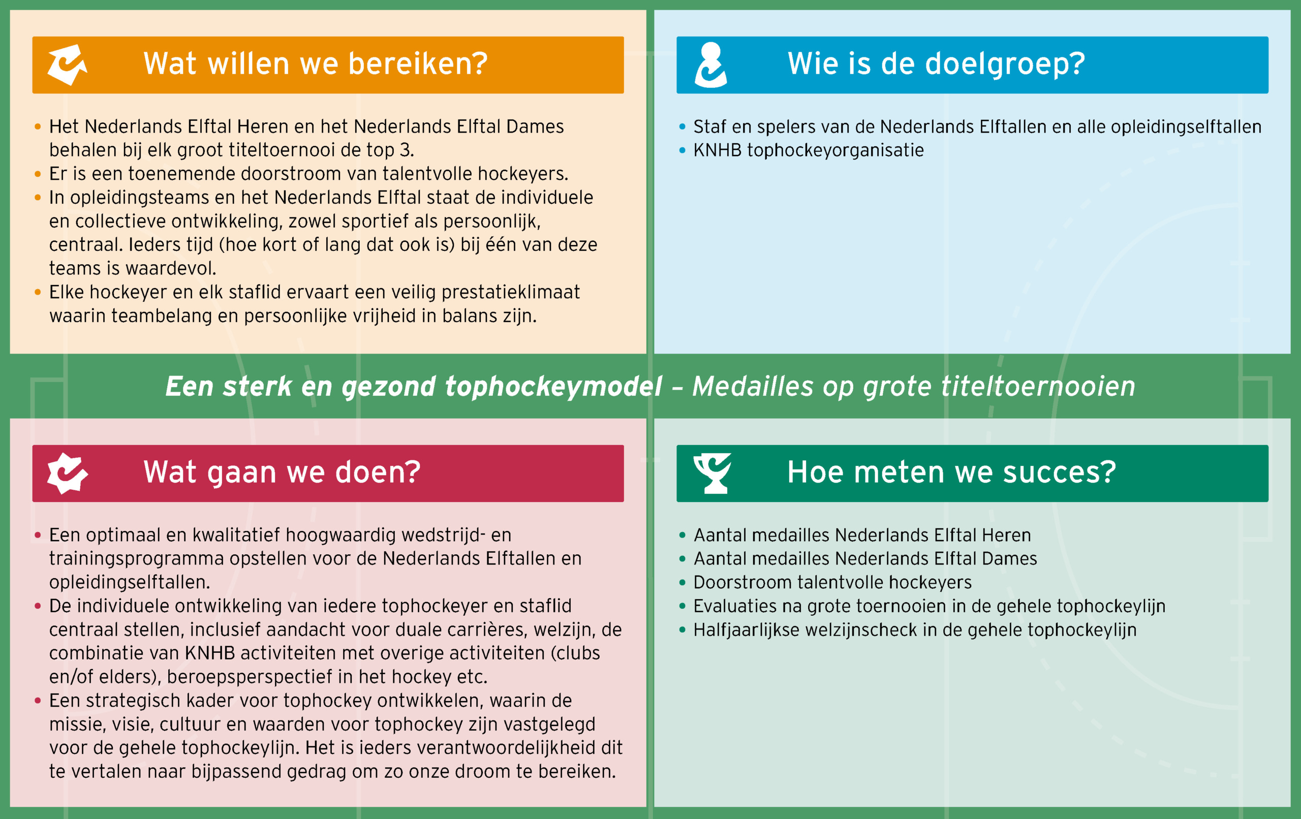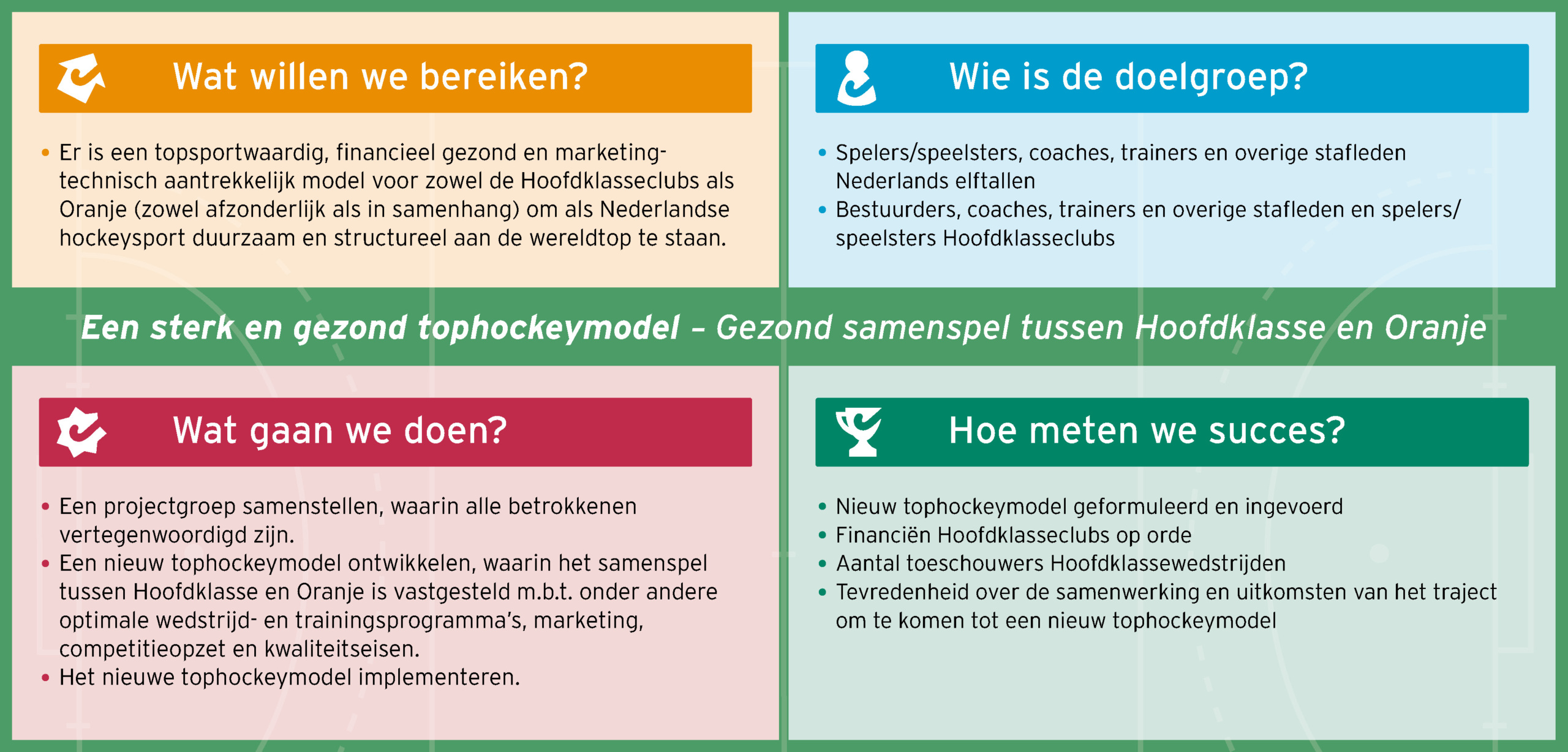 Tophockey floreert als er een optimale aansluiting is tussen de tophockeycompetities en Oranje. Hiervoor moeten we samen een nieuw model creëren, aangezien het huidige model te kwetsbaar is. Een succesvol tophockeymodel resulteert in een ketenreactie: sterke Hoofdklasseclubs, een sterker Oranje, meer medailles op grote toernooien, een grotere fanbase en een gezonder verdienmodel. Aandachtspunten zijn onder andere publiekswerving en marketing, speelprogramma’s, talentontwikkeling en financiële aspecten. Veel partijen worden betrokken bij de ontwikkeling van dit model, waarbij de KNHB de regie kan en wil verzorgen.