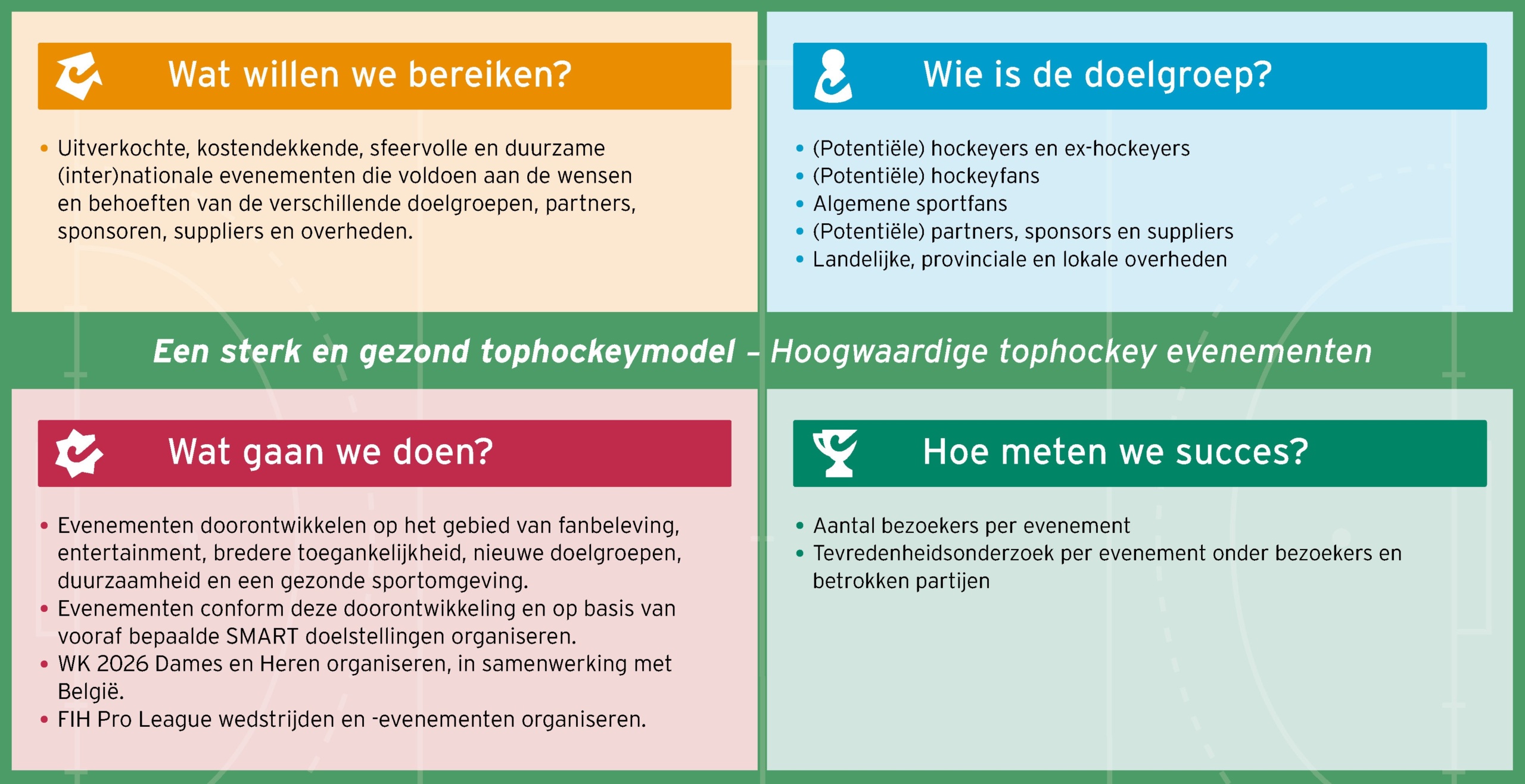 Onze tophockey evenementen zijn een belevenis voor jong en oud, voor sportliefhebbers en hockeyfans, voor tophockeyers en breedtesporters. Tijdens elk evenement verbinden we topwedstrijden met breed toegankelijke side events voor onder andere lokale en regionale doelgroepen. Hierbij streven we naar een brede(re) afspiegeling van de samenleving: Nederland Hockeyland. Daarnaast bieden we onze partners, sponsors en suppliers een podium en brengen we maatschappelijke thema’s onder de aandacht.