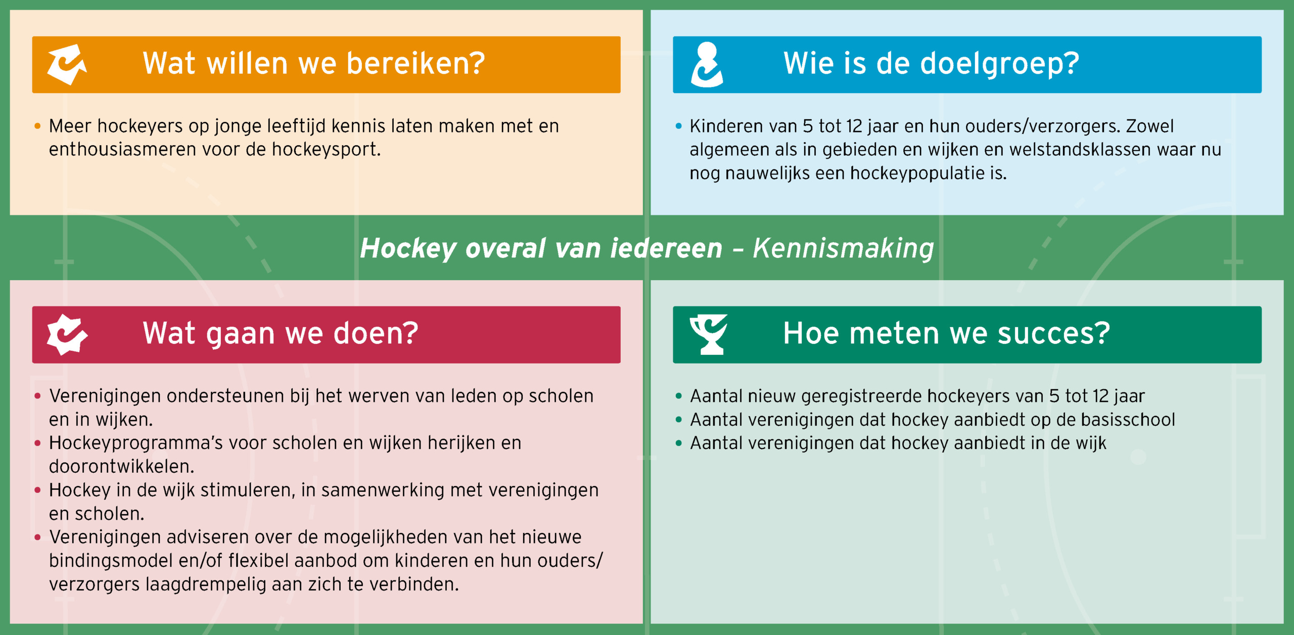Alle kinderen in Nederland van 5 tot 12 jaar maken kennis met hockey op of na school, waardoor hockey wordt gezien als een mogelijke sportkeuze binnen alle gezinnen in Nederland.