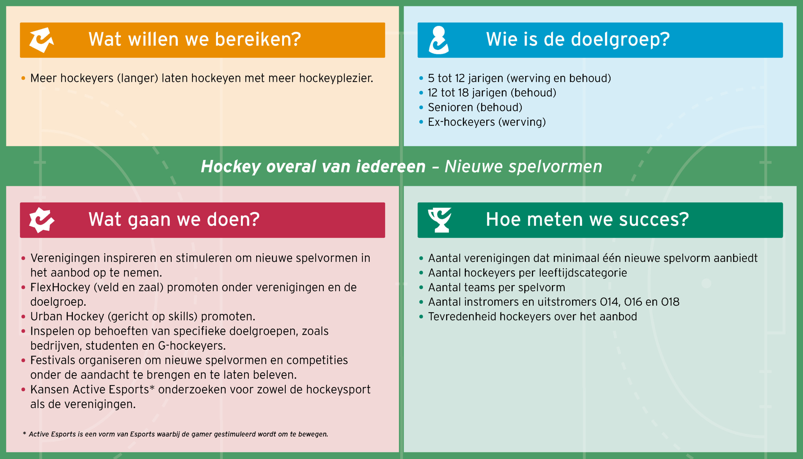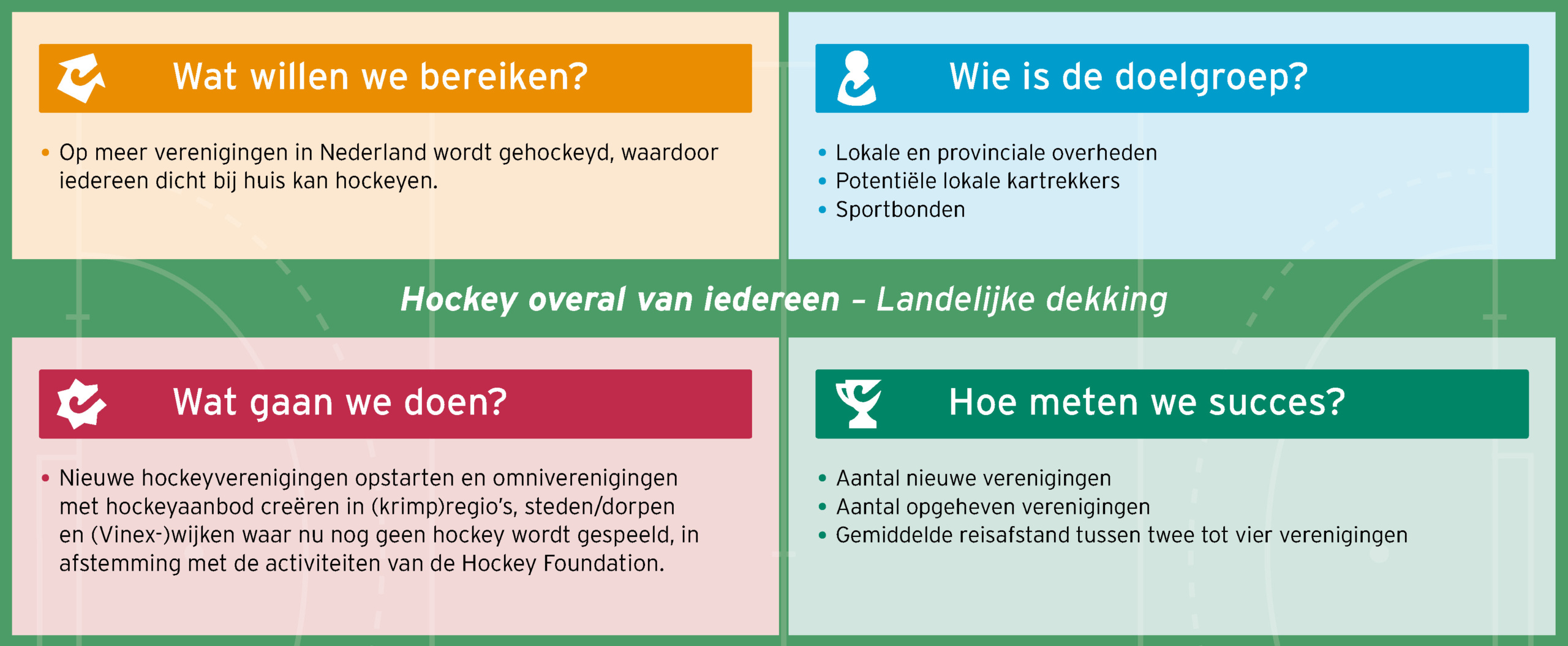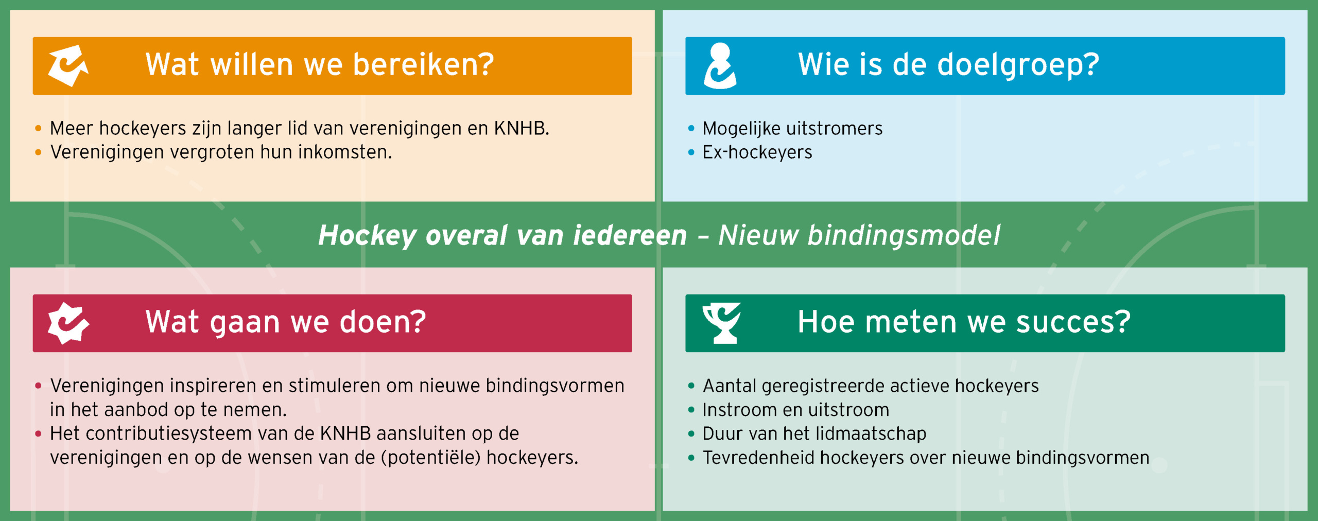 Iedereen voelt zich welkom om te hockeyen. Verenigingen spelen hierbij een sleutelrol, maar hockey kan ook op scholen, in de wijk en via bedrijven. Hockey wordt aantrekkelijker dankzij flexibel en attractief aanbod met nieuwe spelvormen, een landelijke dekking en een nieuw bindingsmodel. Dit alles leidt tot meer hockeyers en meer fans.