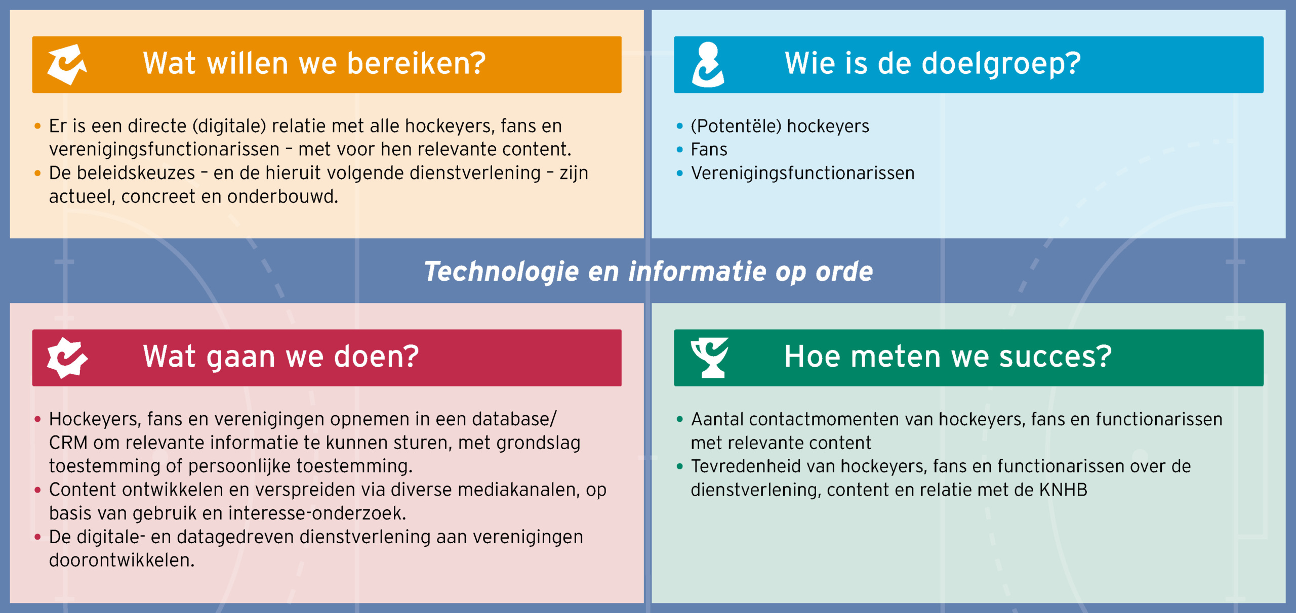 De KNHB hecht veel waarde aan een duurzame (inter)actieve relatie met verenigingsfunctionarissen, hockeyers en fans. Technologie en data spelen daarbij een belangrijke rol. Met behulp van de juiste informatie kunnen we namelijk zorgen voor relevante content op maat. Zo kunnen we elke verenigingsfunctionaris, hockeyer en fan persoonlijk bereiken, met elkaar verbinden en bedienen. Data zijn ook van belang voor het onderbouwen van beleidskeuzes en het efficiënter maken van werkprocessen binnen de KNHB. Het doen van (kwalitatief) onderzoek draagt verder bij aan een verrijking van de (kwantitatieve) data.