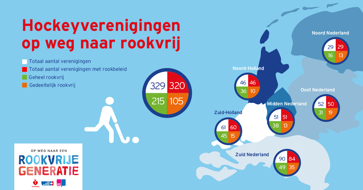 105 verenigingen hebben rookafspraken, wat inhoudt dat op deze verenigingen afspraken gelden met betrekking tot waar niet gerookt mag worden en/of op welke momenten niet mag worden gerookt. Maar het merendeel van de hockeyverenigingen is geheel rookvrij, namelijk 215 verenigingen. Hiermee is zowel het aantal verenigingen dat geheel rookvrij als het aantal dat gedeeltelijk rookvrij is toegenomen ten opzichte van het vorige seizoen.